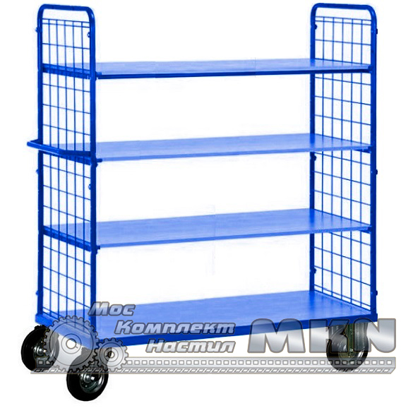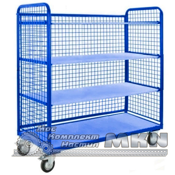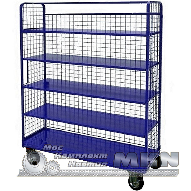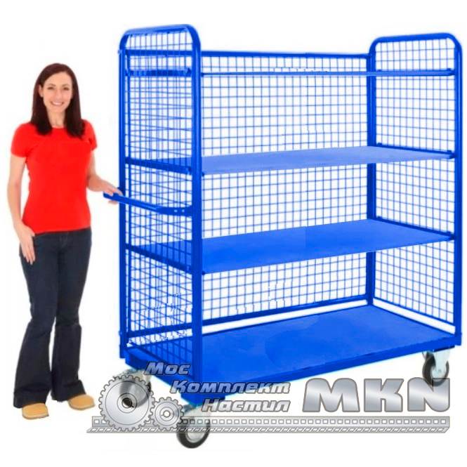 Многоуровневая тележка-стеллаж грузовая 4-х колесная - полки металлические Фотон-MGR MPG. Складская с G-ручкой, 3 стенки защищены сеткой, дно - металл.Передвижной тележка-стеллаж для склада, разборный полки металл, для хранения грузов. Внимание: